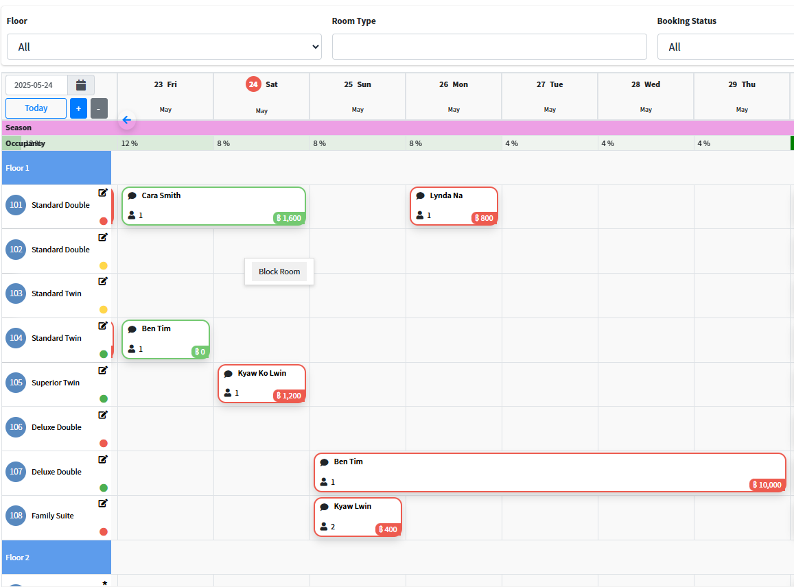 - คลิกขวาในวันที่และห้องที่ต้องการ จากนั้นเลือก Block room