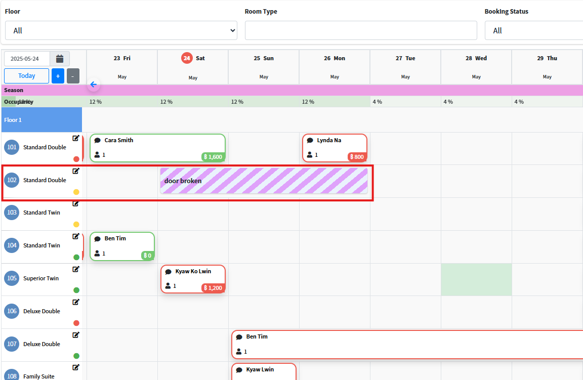 หากได้ทำการปิดห้อง/ block ห้องไว้จะมีแถบสีทึบขึ้นมา และตัวจำนวนห้องพักที่ส่งไปขายยัง OTA จะถูกปิดไปโดยอัตโนมัติตามช่วงวันที่ได้ปิด/ block ไว้