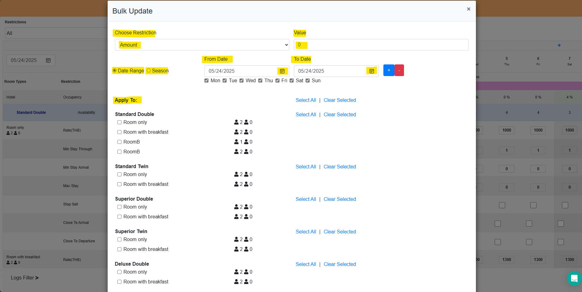 ในกรณีที่ท่านต้องการเปลี่ยนแปลงข้อมูลเป็นจำนวนมาก ท่านสามารถคลิกที่ Bulk Update (ปุ่มสีฟ้าด้านล่าง) เพื่อทำการเปลี่ยนแปลงราคา รวมถึงปิด-เปิด การขาย โดยสามารถเลือกช่วงเวลา ประเภทห้องและ ประเภทเรทแพลนได้