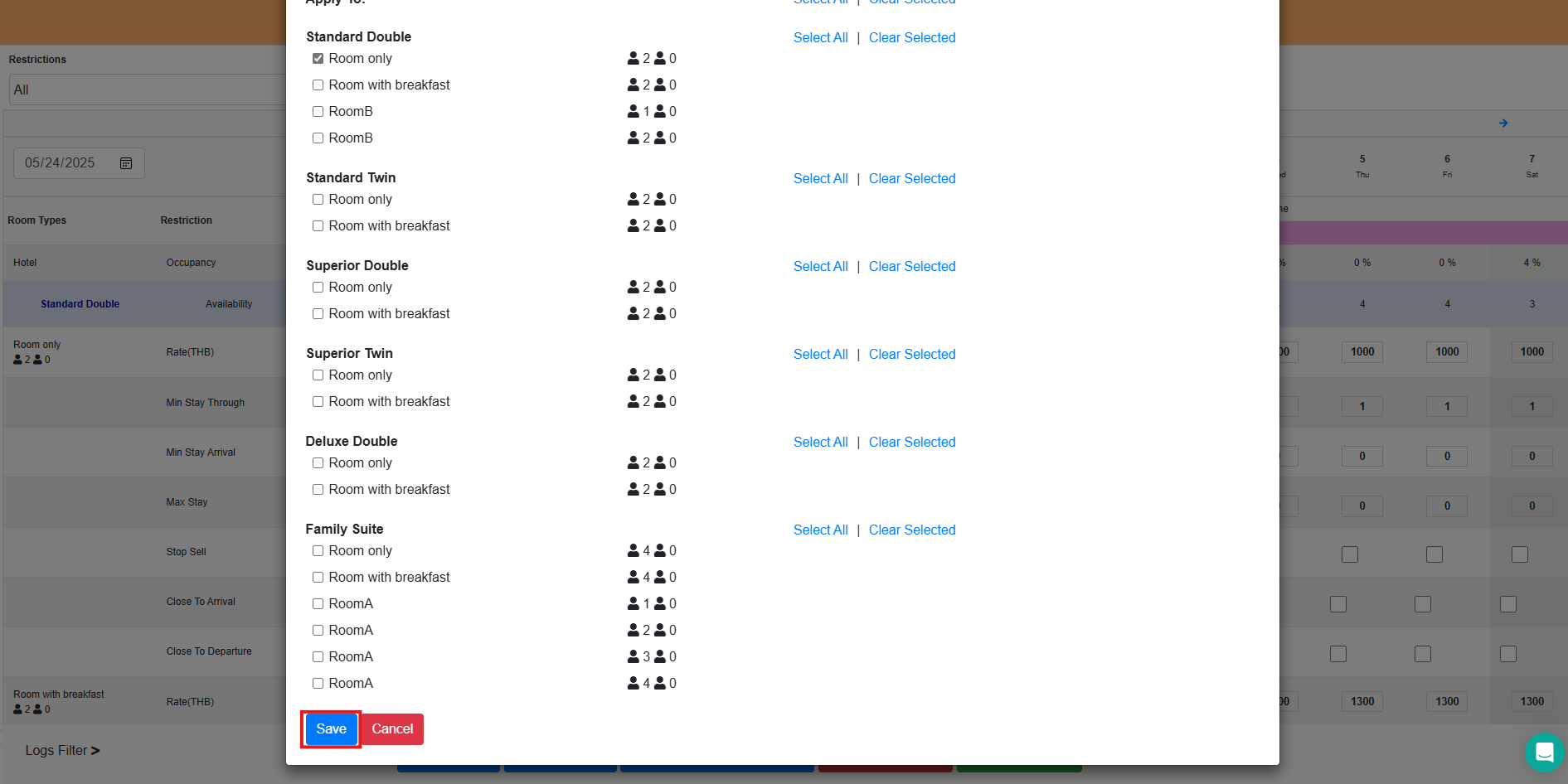 โดยทำการคลิกเลือกประเภทห้อง เรทแพลน และช่วงวันที่ต้องการปิดการขาย จากนั้นคลิก save