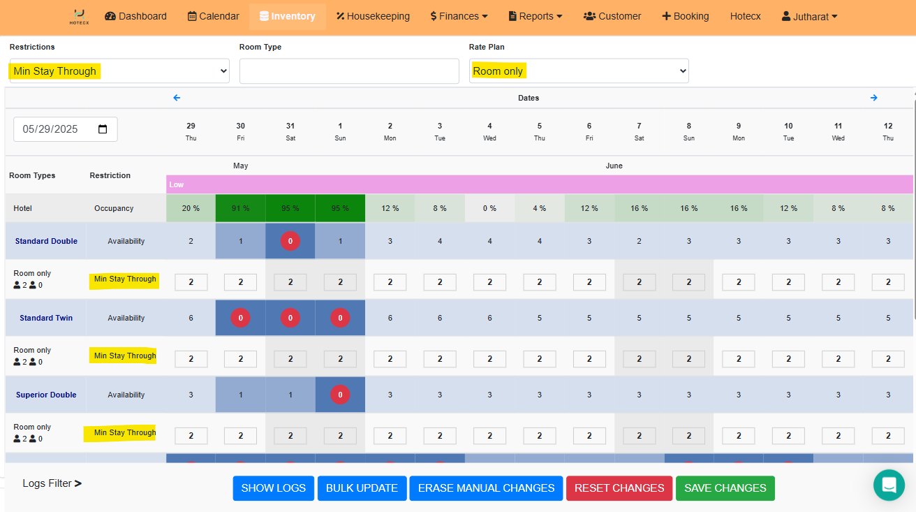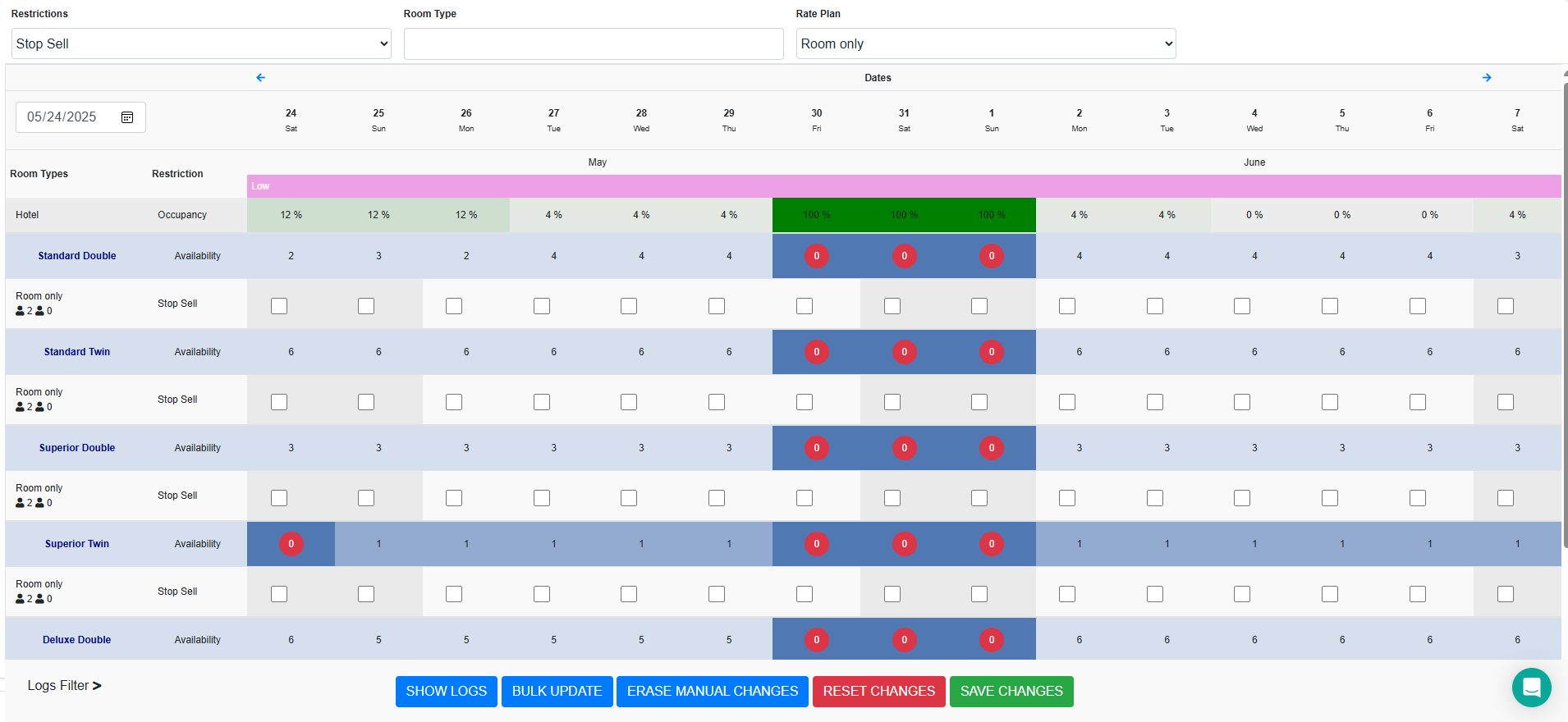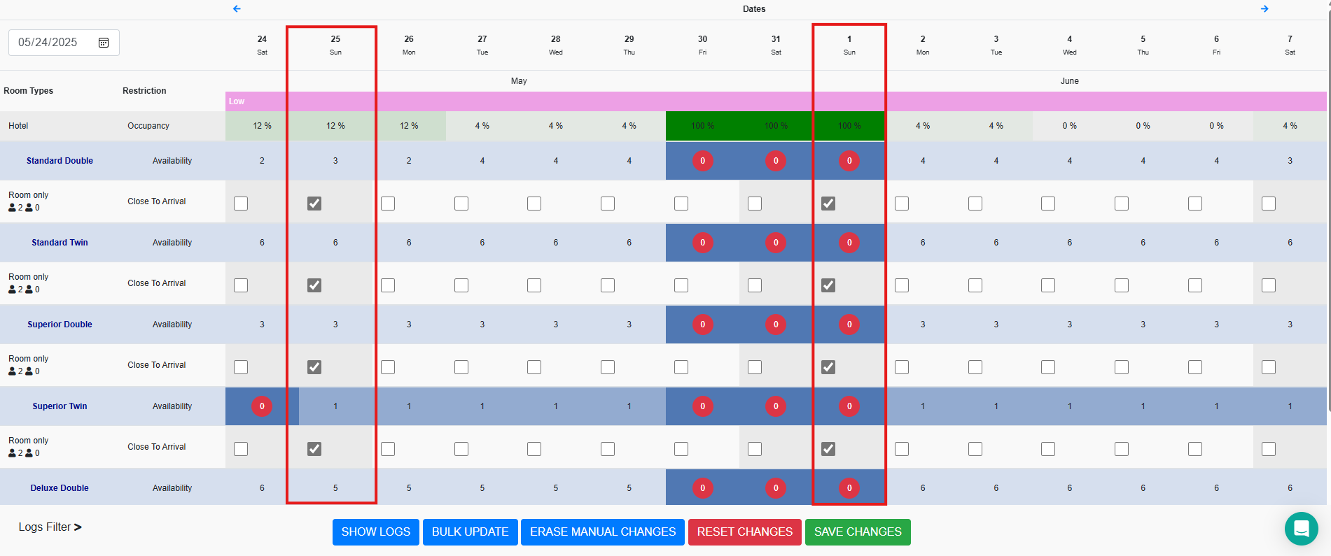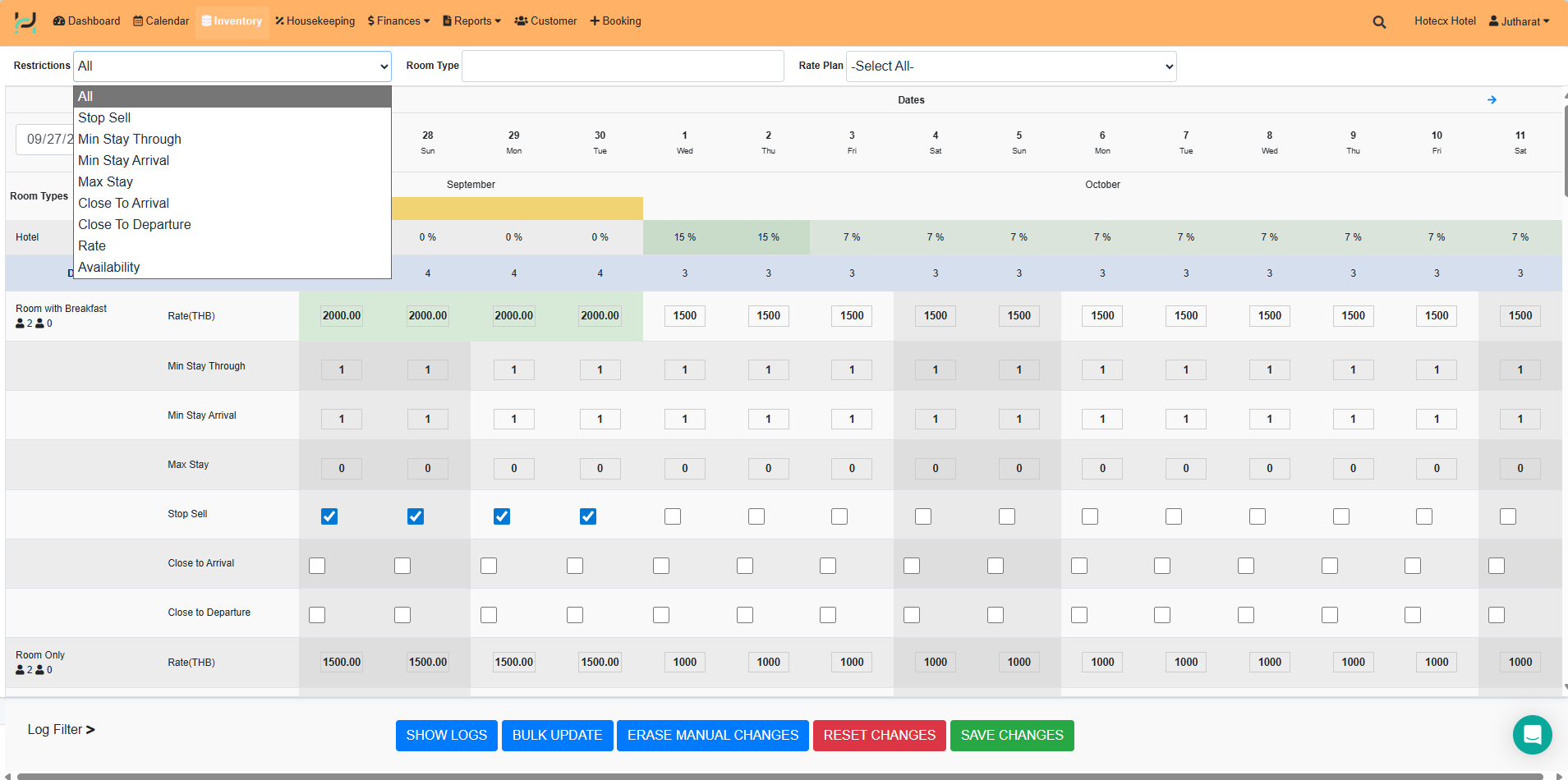 เพื่อให้สามารถปรับเปลี่ยนราคาได้อย่างรวดเร็ว ท่านสามารถปรับแก้ราคาขายของห้องพักได้ใน inventory tab ทั้งแบบแก้ไขข้อมูลเป็นรายวัน หรือแบบ bulk updates เพื่อการแก้ไขข้อมูลจำนวนมาก