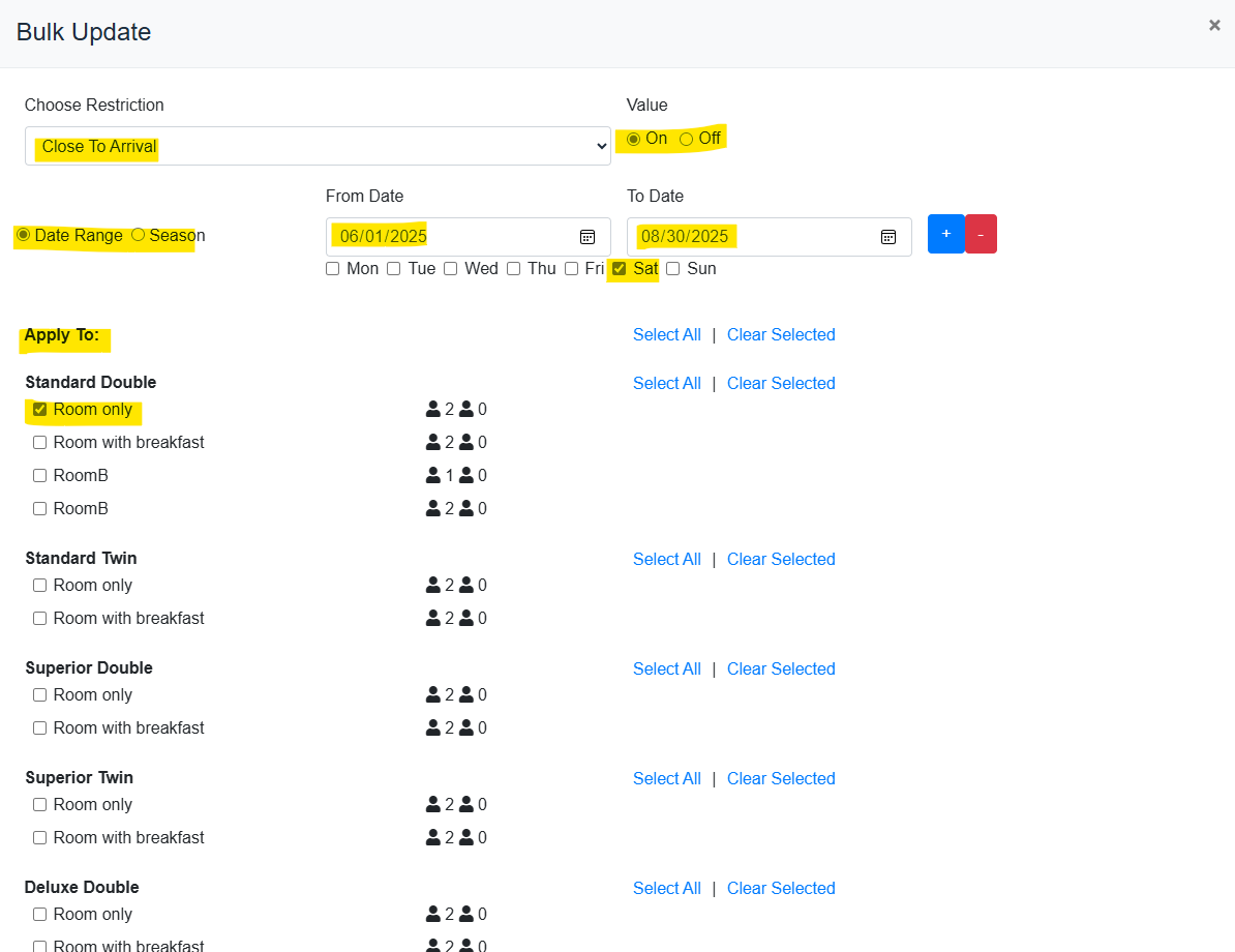 - Max Stay Arrival – จำกัดจำนวนคืนการเข้าพัก (ไม่เกินจำนวนคืนเข้าพักสูงสุด)
