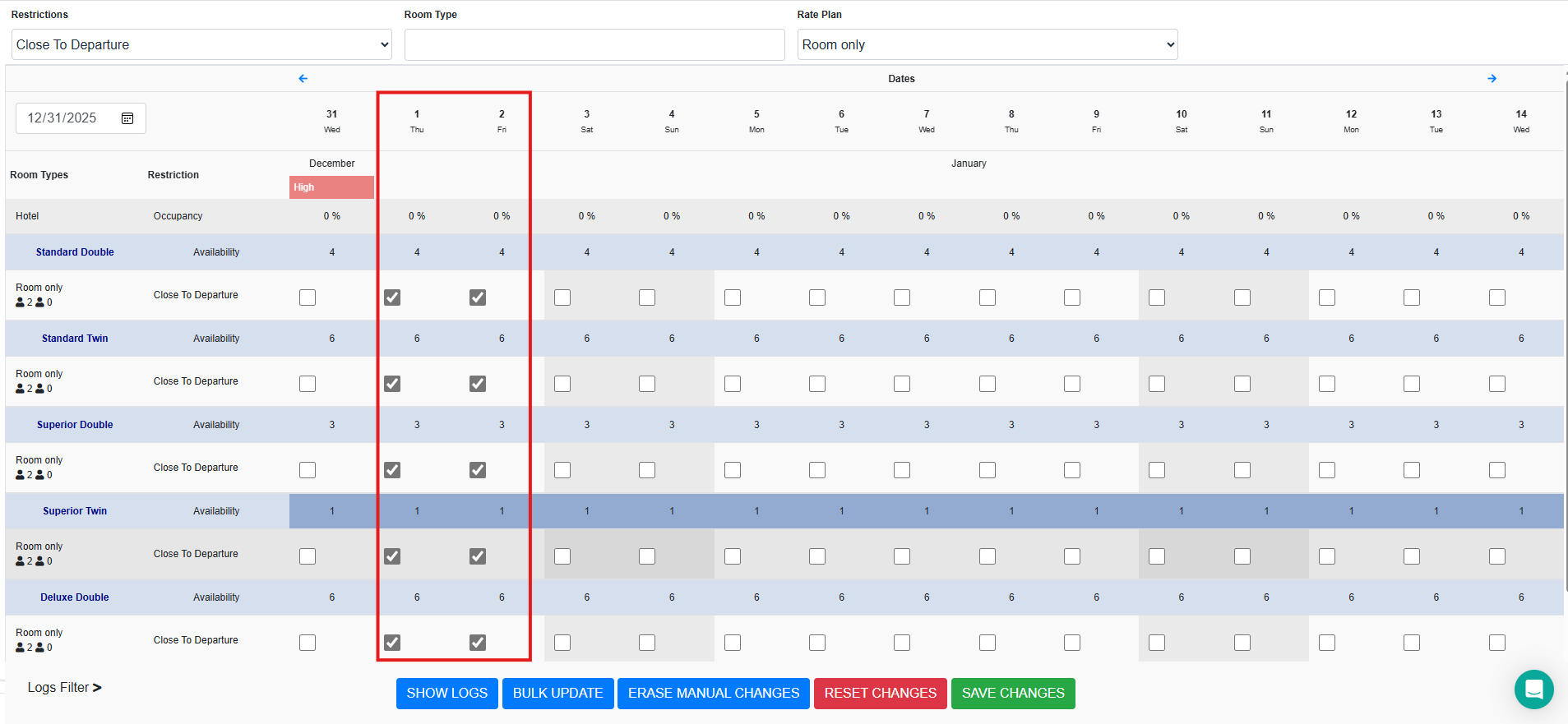 การตั้งช่วงในวันขึ้นปีใหม่, วันก่อนวันขึ้นปีใหม่ โดยไม่ต้องการให้แขกเช็คเอาท์ในวันที่ 1 ซึ่งตรงกับวันศุกร์ สามารถตั้ง closed to departure ทั้งวันศุกร์และเสาร์ โดยแขกจะสามารถเช็คเอาท์ได้ในวันอาทิตย์ ดังภาพ