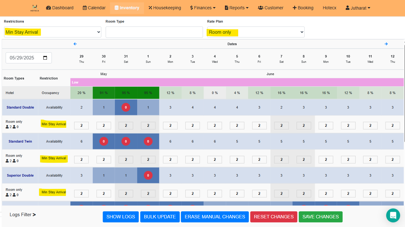 ในหน้า Inventory หากท่านทำการเปลี่ยนแปลงราคาห้องใดห้องหนึ่งในช่วงเวลานั้นๆ ช่องของราคาจะปรากฏเป็นสีเขียว เพื่อแสดงให้เห็นว่ามีการปรับแก้ราคาใหม่เข้าไปแทนที่ราคาเก่าที่เคยตั้งค่าไว้ในระบบ